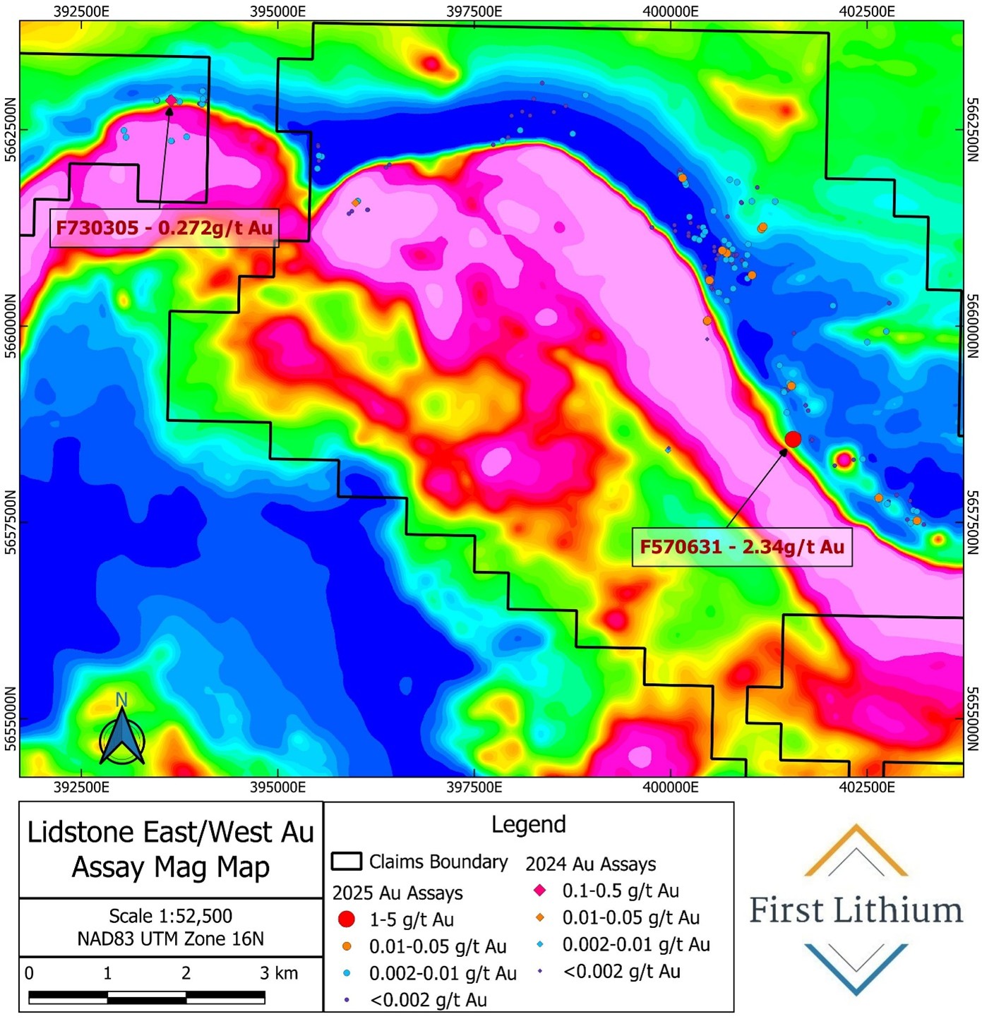 First Lithium Announces New Gold Discovery Up to 2.34 g/t and Additional Claims Staking at Lidstone Project